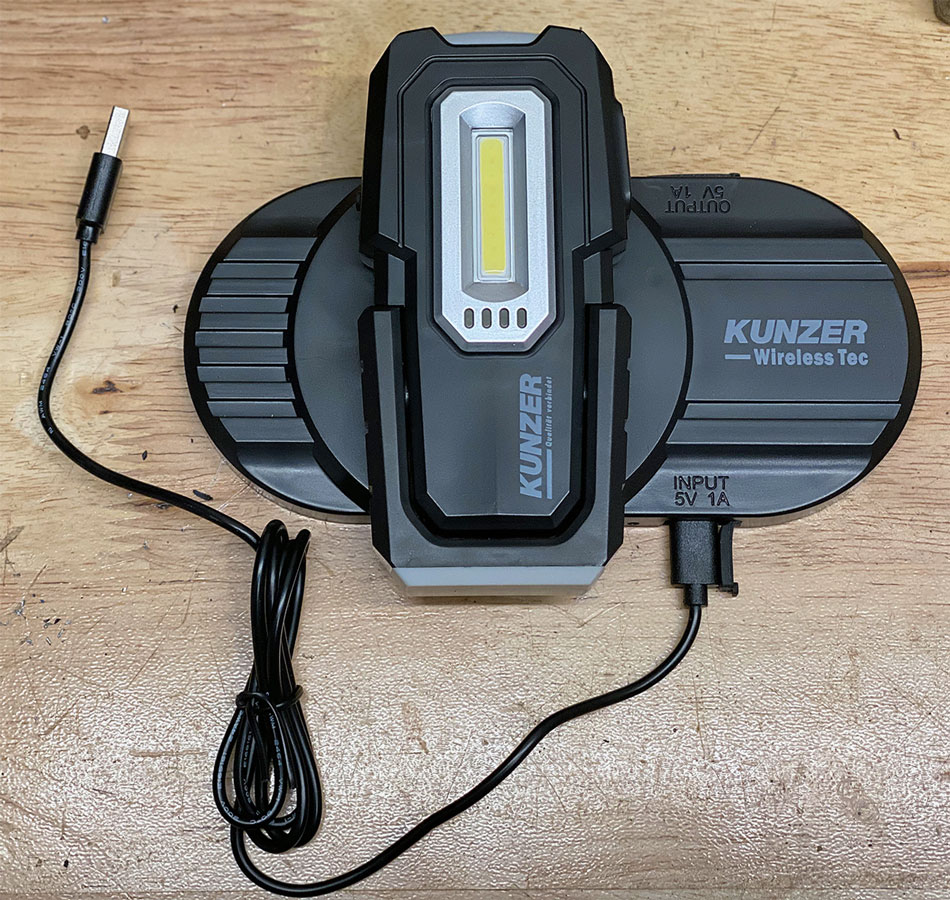 Die handliche Leuchte kommt mit einer Induktions-Ladestation, die sich dank Magnet an Metallflächen (z.B. Werkstattwagen) anheften lässt. Bohrlöcher sind aber auch vorhanden. Die Lampe haftet in jeder Lage, ebenfalls magnetisch, daran. Der Anschluss erfolgt über einen USB-Stecker, ein passendes Netzteil ist im Lieferumfang aber nicht enthalten. Das verwundert den Hobbyschrauber zunächst, Werkstattwagen von Profis haben aber oft einen Diagnose-Laptop an Bord. USB-Ladegeräte hat man i.d.R. ja mittlerweile mehrere zuhause rumliegen, alternativ kann die Lampe auch direkt über eine USB-Buchse geladen werden.