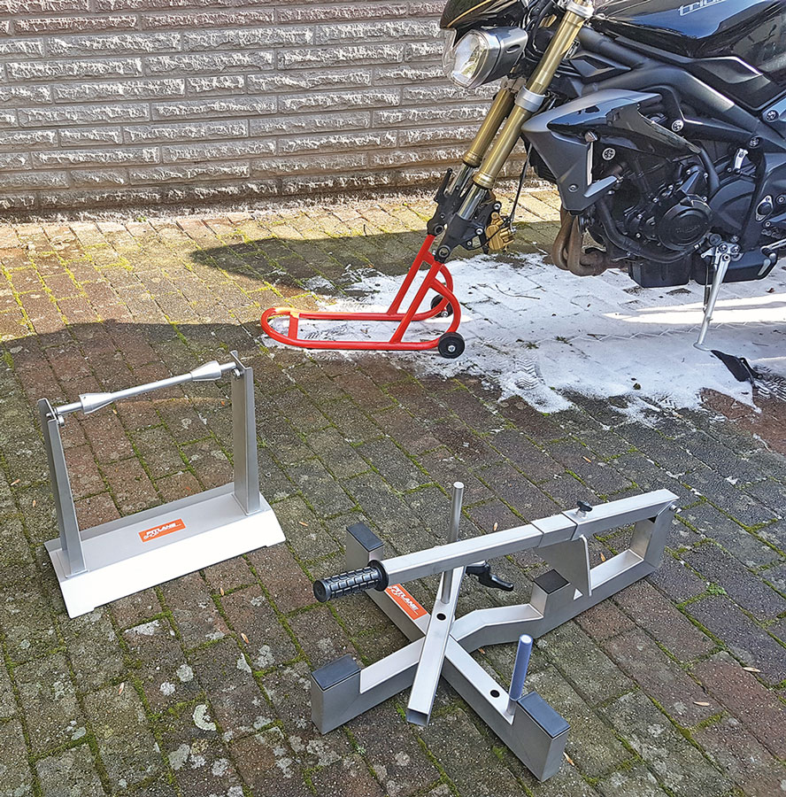Wer selbst gerne schraubt und die nötigen Kilometer im Jahr auf der Landstraße oder gar der Rennstrecke verbringt, für den können wir beide Sets auf jeden Fall empfehlen. Die Verarbeitung ist bei beiden Herstellern exzellent. Wer große Felgen (17–21 Zoll) hat und Wert auf perfektes optisches Finish legt, der ist beim glasperlengestrahlten Set aus Edelstahl vom Pitlane-Shop richtig. Der Preis und die Gimmicks, wie die integrierte Wasserwaage am Wuchtbock, machen das Set von Max2H (15–19 Zoll; Max2H Evo2 (ab April 2018) kann bis 21 Zoll) zu einer Alternative. Wir können auf jeden Fall beide Sets bedenkenlos empfehlen. Für Motorräder mit Einarmschwingen sind übrigens bei beiden Herstellern spezielle Adapter notwendig.