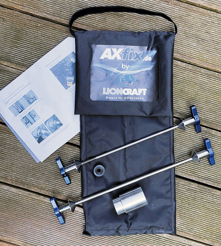 Axfix (Made in Germany) ist über den Lioncraft-Onlineshop unter www.lioncraft.de erhältlich, als Set ab 199 € erhältlich, einzeln für eine Frontachse kostet Axfix inkl. 4 Jahren Garantie 119 €. Ebenfalls im Shop findet man die empfehlenswerten Spanngurte von CargoBuckle, die wir im Jahr 2013 schon einmal vorgestellt hatten (siehe <hier>). Sie funktionieren quasi wie Sicherheitsgurte beim Auto. In Verbindung mit dem Axfix muss man aber darauf achten, dass zum sicheren Verzurren der Abstand zwischen Achse und Befestigungspunkt am Fahrzeug groß genug ist, da die Cargo Buckles (wie auf den Bildern zu sehen) auch voll eingezogen länger sind als ein herkömmlicher Spanngurt.
