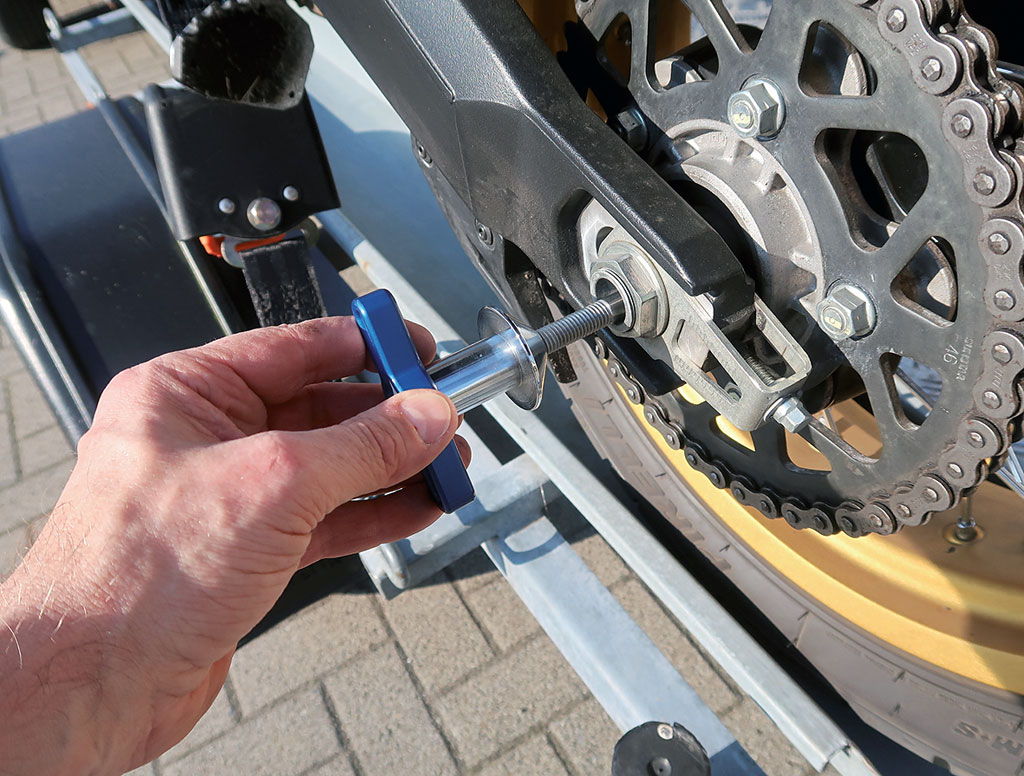 Im Lieferumfang befinden sich in einer Nylontasche zwei Stangen, die an einer Seite jeweils ein Gewinde haben. Sie werden durch die Hohlachsen des Motorrades gesteckt und ein Knebel handfest aufgeschraubt. Durch je einen Konus an den Seiten zentrieren sich die Stangen selbst, Werkzeug wird keines benötigt. Bei Fahrzeugen mit Einarmschwinge (auch z. B. BMW-Modelle mit Kardan), wird zusätzlich ein modellspezifischer Adapter eingesetzt. Das Ganze ist blitzschnell montiert und nach dem Abladen ebenso schnell entfernt.
