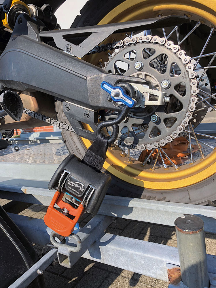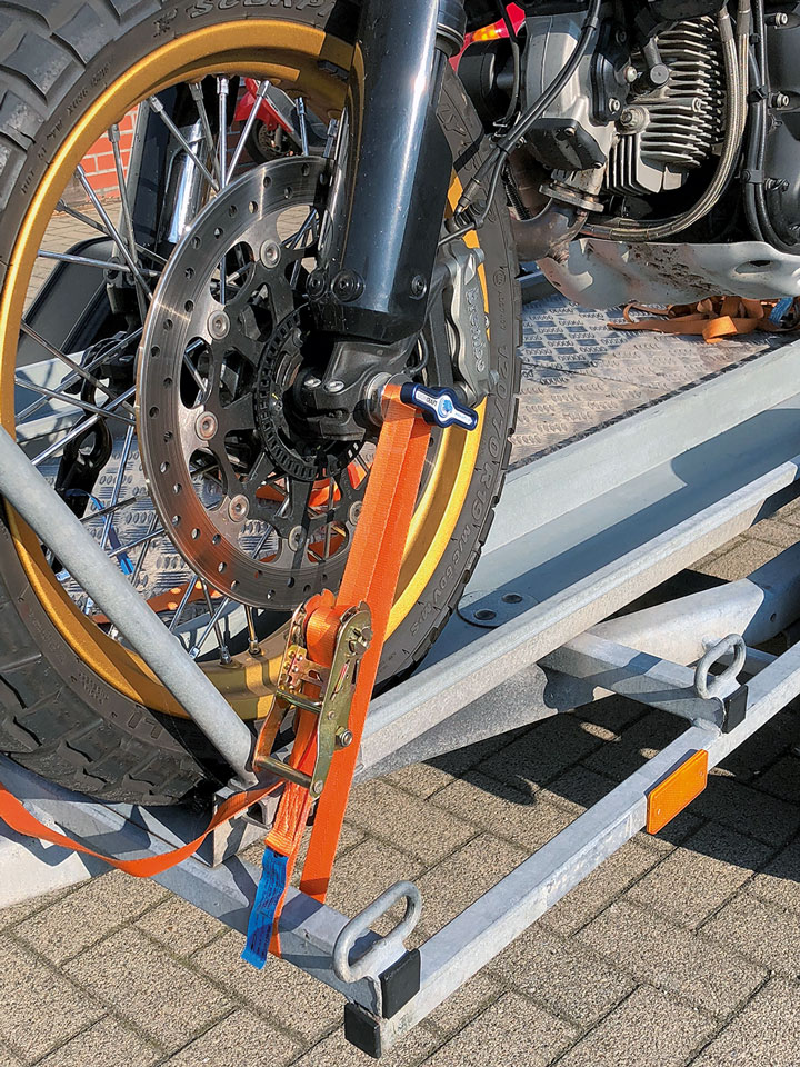 Wer häufiger (s)ein Motorrad transportiert, kennt das Problem: wie befestige ich die Gurte, ohne dass Lackteile oder Auspuff verkratzt werden. Sollen dann gleich mehrere Maschinen auf den Anhänger oder in den Transporter, wird es beim seitlichen Verspannen auch mal eng – für den Seitenhalt brauchen die Gurte Platz. Kommt man dann am Reiseziel an, leckt womöglich auch noch die Gabel oder das Federbein, da die Federelemente – kräftig vorgespannt – unter dem ständigen Druck leiden und die Simmerringe nachgeben.