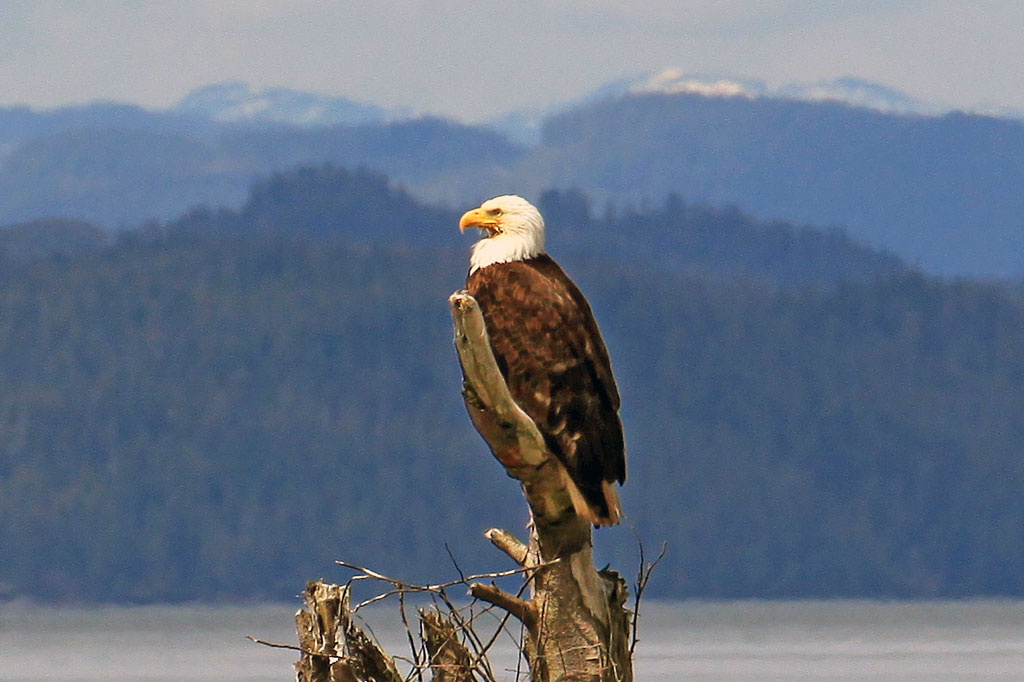Es ist früh am Morgen, als wir nach ein paar Tagen wieder in den stählernen Bauch der Fähre rollen. Die Berge der Insel liegen noch im Nebel verborgen, als das Schiff Fahrt aufnimmt. Wir stehen an Deck und beobachten einen Weißkopfseeadler, der in der Ferne auf dem Ast einer Tanne thront. Seine lauten Rufe, diese hohen Töne, die so charakteristisch für British Columbia sind, sind das letzte was wir von der Insel wahrnehmen.