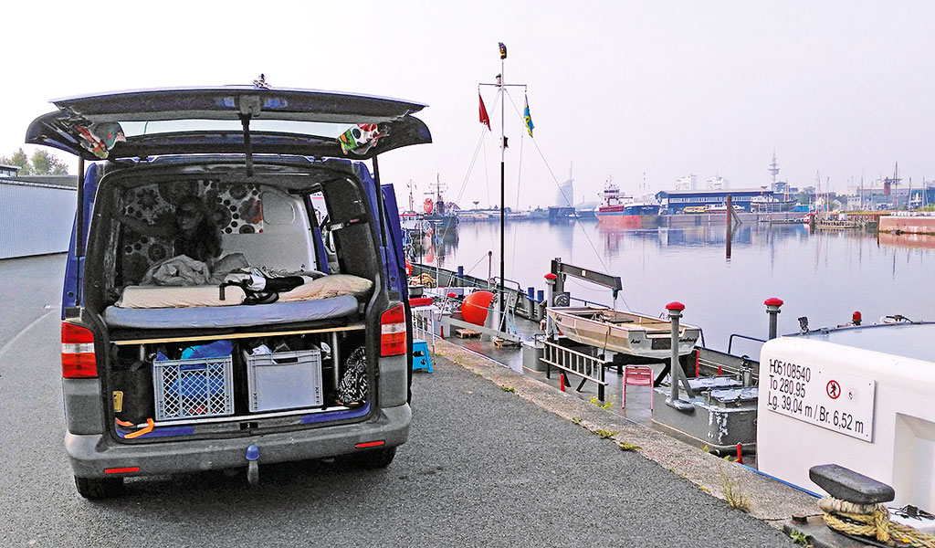 Nachdem wir Zeltplatz, Hotel, Privatunterkünfte in und um Bremerhaven ausprobiert haben, geht es diesmal mit unserem Bulli los. Ohne Plan wollen wir so nah wie möglich an der Rennstrecke campen. Naiv, oder? Diesmal wird diese Blauäugigkeit belohnt. Wir reisen am Samstagnachmittag an und finden einen superschönen Platz direkt am Hafen und parken unseren VW Bus neben Schiffen und zwischen anderen Campern. Die Sonne scheint. Romantik pur.