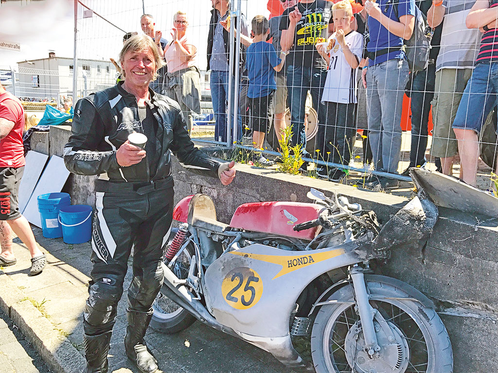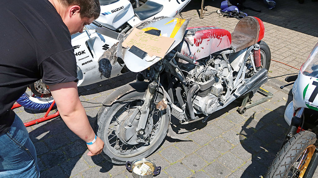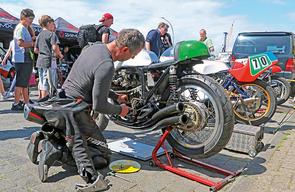 Die Fahrer sind in der Regel keine Profis, wenn auch ziemlich rennerfahren. Man glaubt es immer gar nicht, was für Gestalten unter den Helmen stecken. Das FHR zeigt, dass man nicht jung sein muss, um 1a sportliche Leistungen zu zeigen. Graue Haare soweit das Auge reicht. In den sehr sportlichen Klassen sinkt jedoch meistens das Alter. Viele IDM, IRRC, Isle of Man und Macau Grand Prix Akteure, wie z.B. Didier Grams sind hier am Start. Die meisten der älteren Maschinen sind in liebevoller Kleinarbeit selbst zusammen geschraubt. Woher ich das weiß? Die Fahrerlager (für die 400 Teilnehmer) sind Tag und Nacht geöffnet. Hier kann man bummeln, staunen und mit den Fahrern sprechen. Die freuen sich eigentlich über jede Ablenkung.