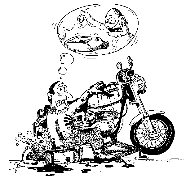 Weil ja das Ölwechseln eine der leichtesten Übungen ist, macht man es natürlich selbst! Supereinfach wäre es, wenn man das Mopped über einen Gulli fährt, Schrauben auf und Juchee! Das ginge, na klar, auch auf dem Hof des ungeliebten Nachbarn – aber als heimliche Wähler der Grünen fangen wir den schwarzen Saft brav auf und bringen ihn zur Altölsammelstelle.