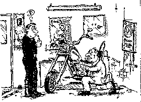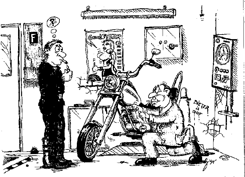 In der Halle ist Hochbetrieb angesagt. Aus allen Richtungen klingt hämmern umd klopfen, quietschendes Gummi und schlagende Metallplanken sind noch die akustischen Highlights. Schon nach gut einer Stunde bin ich an der Reihe, stehe sogar schon in der richtigen Spur. Ich nehme also nur die Jacke vom Lenker und harre in aktiver Gelassenheit der Dinge, die da kommen. Nachdem ich etwa fünf Minuten geharrt hatte, passierte es . „Stellen sie das Krad bitte hierher!”, schnitt es mir von hinten messerscharf in die Ohren. Das Normgesicht hatte sich wieder angeschlichen, schon wieder von hinten. Ich erfüllte seinen Wunsch, das Moped stand nun wieder genau an der Stelle, von der er mich noch kurze Zeit vorher vertrieben hatte, als prophyilaktische Maßnahme sozusagen.