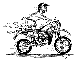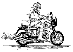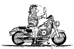Das Motorrad als Einbauküche is sein größter Traum. Er sitzt fett aufen Kunstledersessel, hinten sitzt Mamma, ausse Packtasche glotzt der Pudel und vome innen eingebauten CD-Spieler läuft Country-Musik. Das ganze Wochenende überleecht er sich, wo er nochen Gerät einbauen kann un wo er noch DC-Fix-Folie in Eichenfumiermaserung drüberkleben kann. Nu hat er sich schon neben den Tank ne Mikrowelle eingebaut un annen Lenker n Videorecorder, weiß aber noch nich, wie er noch seine Kaffemaschine unterbringen soll, ohne den Geschirrspüler nochma auszubauen.