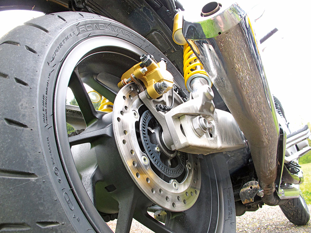 Die RS rollt wie auf Schienen mit ihren 17-Zöllern durch die Kurven. Freundlicherweise hat Honda die aktuell beliebten Standardreifengrößen in 120 und 180 Millimeter Breite genutzt. Das öffnet ein Feld für viele Alternativen in Sachen Reifenwahl, je nach Gusto des Fahrers.