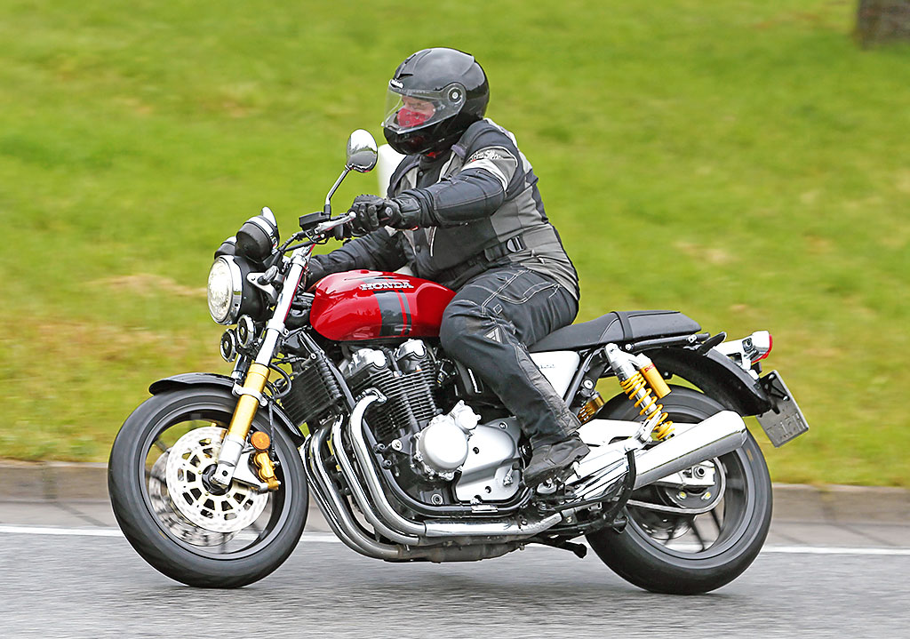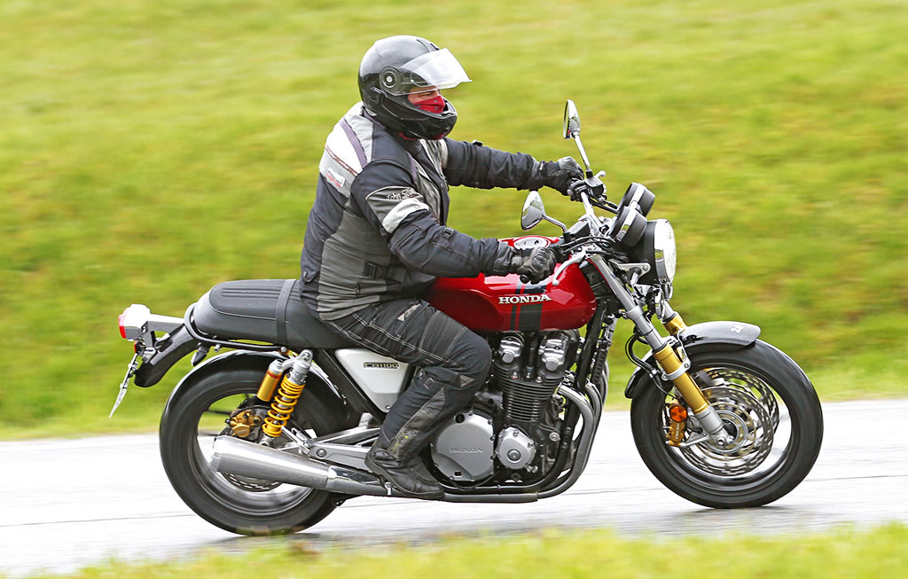 Die radial verschraubten Tokicozangen beißen ABS-unterstützt sehr gut dosierbar in die 310er Scheiben und sorgen so für vehemente Verzögerung. Und auch auf Straßen der Klasse Fifty Shades of Grey macht die Honda eine gute Figur, da das Fahrwerk mit den einstellbaren Doppelfederbeinen am Heck und der ebenfalls einstellbaren 43 mm starken Telegabel an der Front stets die Contenance behält.