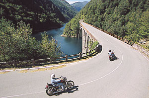 Gut gestärkt und neu orientiert geht es talwärts – anfangs durch sanfte Kurven, an satten Weiden vorbei, später auf schmaler Trasse in den dunklen Wald des Caffaro-Tals hinein, als plötzlich die roten Ziegeldächer Bagolinos zu uns heraufleuchten. Die Hauswände rücken dicht zusammen, das Dröhnen des Boxers hallt monoton durch die Gassen. Wer hier vor die Tür tritt, steht mitten auf der Straße. Unser 65 Kilometer langer Umweg findet am Nordende des Idrosees sein Ende. Allzu gern unterliegen wir der Verlockung, das nächste Tal, den nächsten See anzusteuern. Nach dem anstrengenden Bergauf und Bergab ist erst einmal entspanntes Dahintuckern zu Füßen des legendären Monte Tremalzo angesagt.