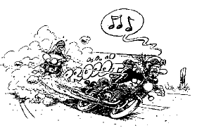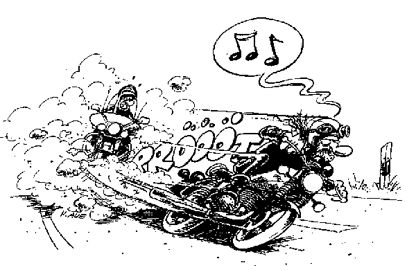 Zehn Minuten später lenkt er sein Schmuckstück behutsam auf den Parkplatz des Motorradtreffs. Zu so früher Stunde ist noch niemand hier. Herr M. klappt den armlangen Seitenständer aus und schwingt sich aus dem Sattel. Wirklich noch niemand hier? Doch, direkt neben der Kaffeebude stehen zwei Motorräder, das eine nicht zu übersehen, das andere kaum als solches zu bezeichnen. Neugierig geht der Arzt näher. Die Electra Glide ist sein erstes Motorrad, mit anderen Maschinen kennt er sich nicht so aus. Aber er ahnt sofort, wen er vor sich hat. Die beiden Spielverderber! Die erste Maschine – das Moped – hat offensichtlich schon seit zehn Jahren keinen Putzlappen mehr gesehen, der Lack war vermutlich einmal blau. Der Auspuff ist fast so lang wie das gesamte Motorrad und genauso rostig. Der Motor sieht aus, als sei er die Laubsägearbeit eines sechsjährigen Kindes. Auf dem seltsam geformten Tank stehen zwei Buchstaben: MZ. Das sagt dem Doktor überhaupt nichts. Ratlos wendet er sich der anderen Maschine zu. Das ganze Ding scheint fast ausschließlich aus Motor zu bestehen, ein schwarzer Riesenblock von bösem und brutalem Aussehen. „Yamaha” liest der Doktor, den Namen hat er schon einmal gehört. Aber was bedeutet „Vmax”? Um dies und anderes zu klären, nimmt er all seinen akademischen Mut zusammen und schlendert zu den beiden kaffeetrinkenden Gestalten an der Bude. Es wird ein langer, anregender Vormittag, an dem nicht mehr viel Motorrad gefahren wird. Obwohl sich die drei prächtig verstehen, ist ihnen klar, daß MZ-, Vmax- und Harley-Fahrer außer ihrer Liebe zu schwarzem Kaffee und filterlosen Zigaretten absolut nichts Gemeinsames haben. Zumindest glauben sie das…