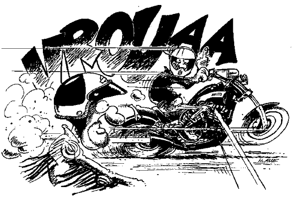 Vor der Windschutzscheibe des amerikanischen Dinosauriers taucht ein schmales Moped auf. Zweitaktgestank erfüllt die frühsommerliche Idylle. Dr. M. rümpft die Nase unter dem offenen Chevignonhelm. Frechheit! Träge setzt die Harley zum Überholen an. Ein leichter Dreh der rechten Hand, der Fünfte ist sowieso schon drin. Doch was ist das? Der kleine Stinker outet sich plötzlich als wahrer Athlet. Deutlich sieht der Doktor, wie der Fahrer seinen gummistiefelbewehrten Fuß zum Gangwechsel nach unten drückt, das Moped nimmt mächtig Fahrt auf, zum Beweis seiner Kraft eine blauweiße Abgasfahne hinter sich herziehend wie ein kleiner Jet.