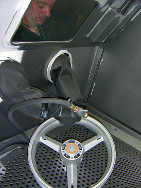 Frisch entlackt werden die zu beschichtenden Teile noch gestrahlt, damit die Oberfläche wirklich metallisch sauber und somit aufnahmebereit für das Pulver ist. Das Bauteil wird nun geerdet, den elektrischen Gegenpol bildet die Pulverpistole. Die Spannung zwischen den Polen beträgt 30.000 Volt. Bläst man die positiv geladenen Pulverteilchen nun mit geringem Druck durch die Pistole, setzen sie sich aufgrund der statischen Aufladung am negativen Pol (dem zu pulvernden Teil) ab. Das Prinzip dürfte bekannt sein – wer hat noch nicht mit einem Kamm oder Luftballon am Pullover herumgerubbelt und dann Papierschnipsel „angesaugt”?!
