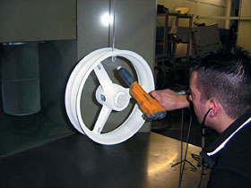 Für andere, leicht korrodierende Motorradteile wie Rahmen, Schwingen, Verkleidungshalter, Felgen und sogar Motordeckel ist die Kunststoffbeschichtung hingegen ideal. Das UV-Licht stabile Polyesterpulver bildet eine sehr strapazierfähige Oberfläche, wie uns Stefan eindrucksvoll demonstriert. Er schlägt ein beschichtetes Eisenrohr mit voller Kraft auf eine stumpfe Kante. Das Rohr verbiegt etwas, in der Pulveroberfläche zeigen sich aber weder Risse noch Abplatzungen – sie liegt weiter fest an. Erst als Stefan das Rohr auf eine scharfe Kante schlägt, schält sich ein kleines Stückchen von der Oberfläche ab. Steinschlag u.ä. äußere Einflüsse dürften gepul- verte Felgen und Rahmen also absolut kalt lassen. Beschichtete Felgenränder sind auch vor Beschädigungen, wie sie leicht durch eine nachlässige Reifenmontage entstehen, gut geschützt.