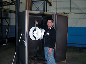 Damit das aufgebrachte Pulver sich zu einer haltbaren Kunststoffschicht verbindet, wird das Werkstück nun in den Backofen geschoben. Bei 200 Grad Celsius schmilzt das Pulver, ein Vorgang, der bei unseren Felgen knapp 30 Minuten dauert. Da das gebackene Pulver im Gegensatz zu Lack nicht aushärtet und „zäh-elastisch” bleibt, ergibt sie die von Stefan bereits demonstrierte hohe Belastbarkeit.