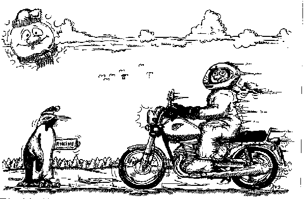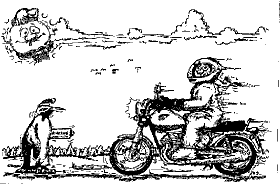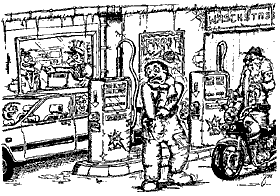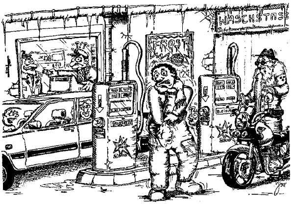 Ich muß versuchen, irgendwie auch ohne Striptease an die Kohle zu kommen. Also, ersten Schal lockern, Regenkombireißverschluß aufziehen. Mist! Der Zip ist für abgestorbene Finger viel zu klein, der Entwurf stammt bestimmt von einem Autofahrer. Nierengurt auf und dann versuchen die Hand bis zur Geldbörse durchzuschieben. Nein, so geht das nicht. Erst noch die Lederjacke öffnen, um mehr Bewegungsfreiheit zu haben. Nun noch den Hosengürtel und dann die Lederhose aufmachen. Verdammt! Schamviolett stelle ich plötzlich fest, daß es wohl kein Augenpaar auf der gutbesuchten Tankstelle gibt, welches nicht gespannt jede meiner Bewegungen verfolgt.