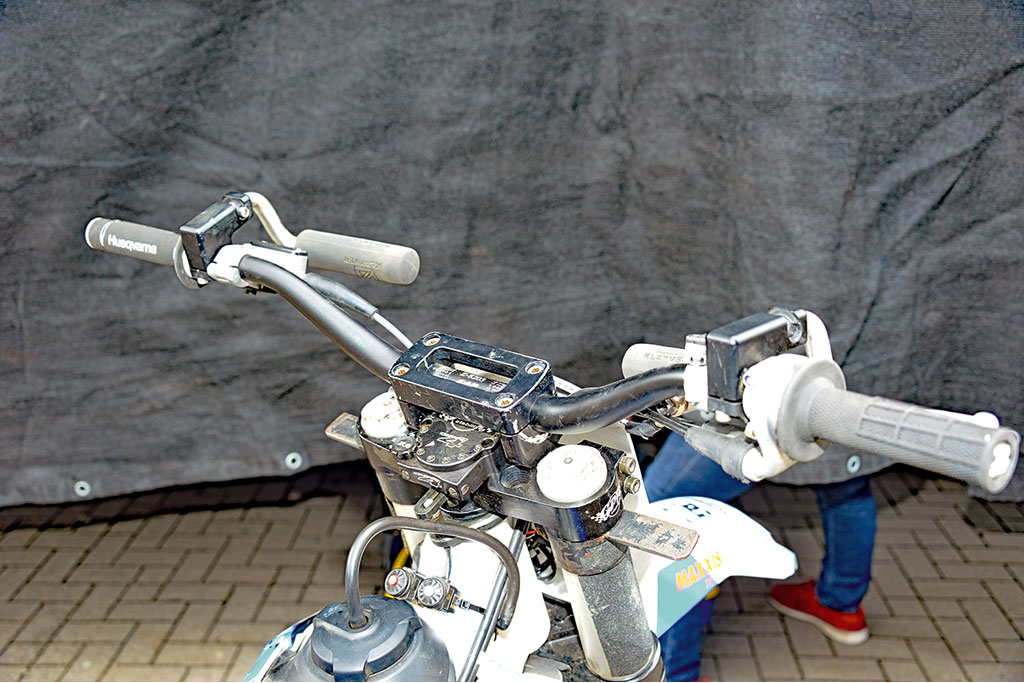 Sein Bike ist eine knapp 100 kg schwere 350er Husqvarna mit 50 PS Leistung. Der Motor ist ein 4-Takter mit Einspritzung, die sich automatisch an wechselnde Außenbedingungen, wie Temperatur und Luftdruck, anpassen kann. Luc fährt die Maschine schon einige Jahre und ist sehr zufrieden mit ihr. 2-Takter mit Vergaser sind komplizierter und wegen der notwendigen Einstellarbeiten immer weniger im FMX Sport gefragt, erklärt er uns.