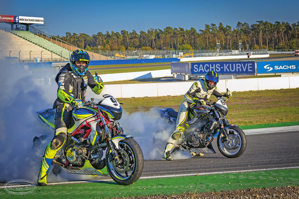 Die Gründer der Firma PS Track Events haben es immer geschafft uns Rasselbande zu bändigen. Somit ging es nach einer Begrüßungsrunde im Cup Zelt und diversen organisatorischen Dingen an die Ausgabe der Team Bekleidung und an die Entgegennahme der Schmiermittelpakete der Firma Motul. Zudem wurde das Motorrad professionell mit den Startnummern und Sponsorenaufklebern des Twin Cups foliert. Somit konnte nun in die freien Trainings und in die ersten Zeittrainings gestartet werden.