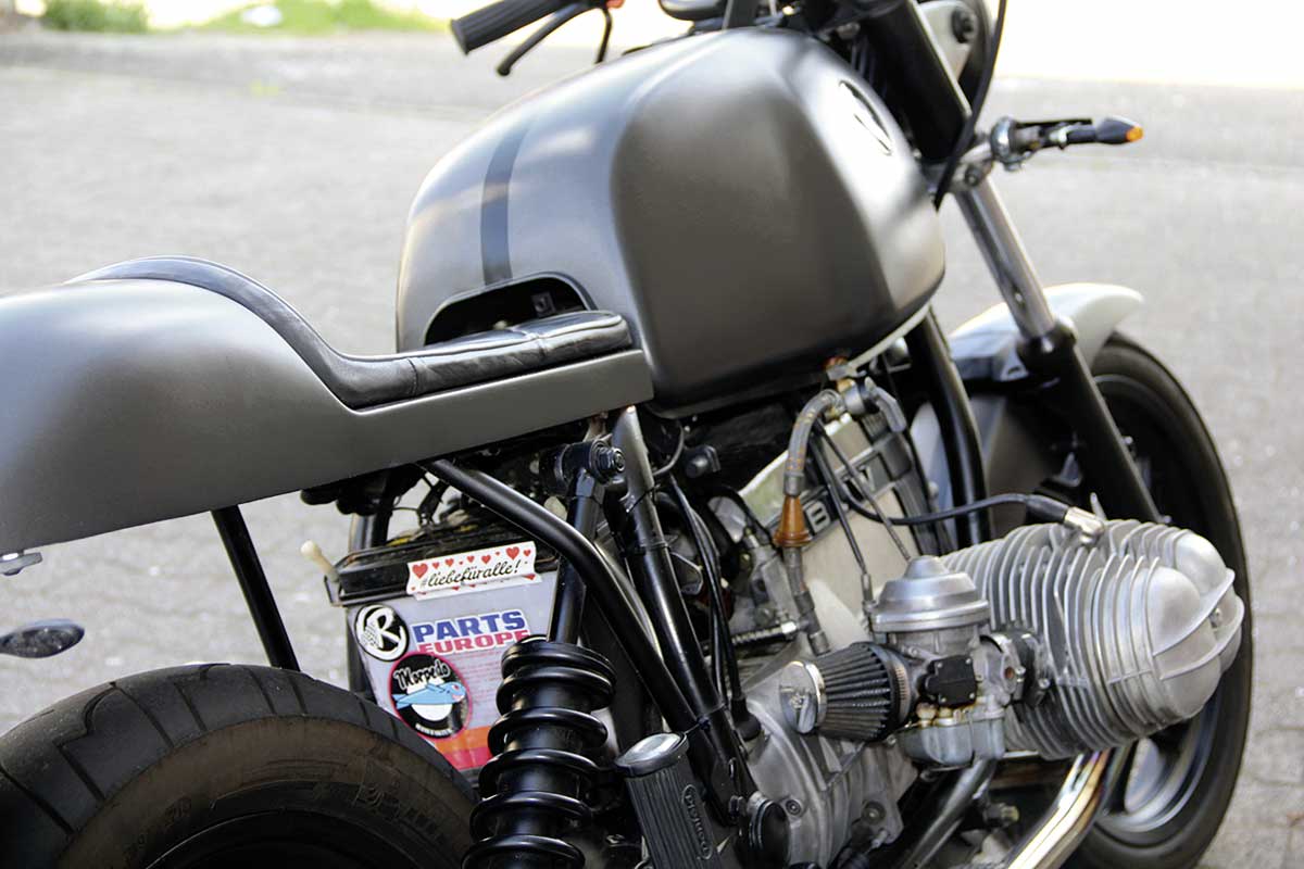 Der kurze Heckrahmen mit Höcker aus GFK stammt von der Morpedo Manufaktur. Sitzbank mit schwarzem Rindsleder und grauer Karo-Naht sowie ein grauer Keder passend zum Lack. Der Lack ist matt und von Porsche. Der Lenker ein mattschwarzer Fehling M-Lenker, der Spiegel klassisch gedreht. Der Schalldämpfer ohne BMW-Vorschalldämpfer, bei Shows mit klassischen britischen Trumpets sonst on the Road mit Muffler. Blinker LED, Heckleuchte LED von Kellermann.