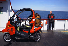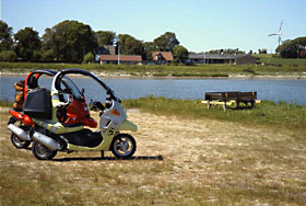 Nach kurzen Überlegungen entschieden wir uns für Dänemark, besser gesagt für Jütland. Ausgangspunkt war Husum in Nordfriesland, wo wir uns für vier Tage beim ortsansässigen BMW-Händler zwei C1 liehen. Nach Auskunft der dänischen Botschaft in Berlin gelten für deutsche Touristen mit ihren Fahrzeugen die gleichen Regeln wie in ihrem Heimatland, d. h. Helmbefreiung und Gurtpflicht beim BMW C1. Der eine C1 war mit einem Topcase ausgestattet, so dass eine Reisetasche gut Platz finden konnte. Ein kleiner Rucksack, an der Kopfstütze befestigt und auf das Topcase gesetzt, erfüllte ebenfalls gute Dienste. Auf dem zweiten C1 wurde ein großer Reiserucksack befestigt. Gegen den Seitenwind trugen wir Mützen.