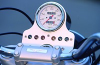 Der Lenker ist recht hoch, doch nicht übermäßig breit, die Kröpfung ist angenehm. Auch die Füße müssen nicht zu weit nach vorne gestreckt werden, wohl ein Verdienst der im Wege stehenden Zylinder. An den Schaltereinheiten gibt es nichts auszusetzen, sie ähneln den guten japanischen Standardeinheiten doch sehr. Da ist nichts mehr mit den bunten, verspielten Knöpfchen Marke Lego. Kupplungs- und Bremshebel liegen gut in der Hand, beide sind nicht einstellbar. Das Cockpit ist auf das Wesentliche reduziert, den Tacho und sechs Kontrollleuchten – that’s it.