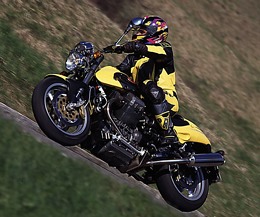 Ganz besonders gut leben läßt sich mit dem mächtigen Antritt der Centauro. Der aus der Daytona stammende Motor zieht aus niedrigsten Drehzahlen heraus brutal los. Die Gasannahme ist perfekt, ab knapp 3000 U/min hat es ein Ende mit den derben aber nicht unangenehmen Vibrationen. Aber auch oberhalb dieser Drehzahl bleibt jederzeit deutlich spürbar, daß unter einem zwei große und nicht vier kleine Zylinder befüllt und geleert werden.