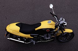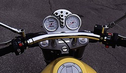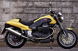Was allerdings nicht so recht passen möchte, ist die Sitzposition. Der fast gerade Lenker ist meilenweit vom Sitzplatz entfernt – also etwas für lange Menschen. Die Fahrerfußrasten liegen dafür sehr hoch und recht weit hinten – also etwas für kurze Menschen. Die Tankausbuchtungen passen dafür ideal für Fahrer zwischen 1,70 und 1,80 Meter Länge – also für’s gesunde Mittelmaß. Im Endeffekt sitzt praktisch niemand auf Dauer bequem. Andererseits: Waren Ape-Hanger, M-Lenker oder Tommaselli-Stummel jemals bequem? Genau – und es hat trotzdem Spaß gemacht. Wer bequem sitzen möchte, soll sich gefälligst eine Gold Wing oder einen Fernsehsessel kaufen – oder so. Freude kommt beim Anlassen auf. Dank der Einspritzanlage samt elektronisch geregeltem Motormanagement von Weber-Marelli klappt der Kalt- und Warmstart völlig problemlos und immer auf Anhieb. Italo-Fans mit Lafranconi-Hörschaden müssen allerdings die Ohren ganz genau spitzen um zu merken, daß der Twin tatsächlich läuft – der Guzzi-Sound ist absolut gesetzeskonform und damit sehr zurückhaltend. Weitaus beeindruckender sind da schon die Lebensäußerungen, die der 90°-V-Motor in Form heftiger Vibrationen von sich gibt. Das Motto des mit Leerlaufdrehzahl polternden Vierventilers lautet „Shake, rattle and roll”.