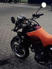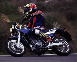 Doch nicht nur auf Landstraßen fühlt sich die Mastiff pudelwohl, auch im Stadtverkehr überzeugt sie. Durch das geringe Gewicht, die aufrechte Sitzposition kann man jede Lücke nutzen und aufgrund der guten Bodenfreiheit braucht man auch Bordsteine und Treppenstufen nicht zu scheuen. Der Seitenständer klappt zwar in eine ungewöhnliche Stellung, doch das stört im Alltag nicht, und das zentrale Lenk-/Zündschloß verriegelt den Lenker sowohl bei Rechts- als auch bei Linksanschlag. Auf langen Geraden kommt etwas Langeweile auf, doch der Yamaha-Einzylindermotor hängt gut am Gas und so bringt man diese unangenehmen Unterbrechungen zwischen zwei Kurven schnell hinter sich. Überhaupt kann das Triebwerk im Alltag voll überzeugen. Solange man nicht das Parklicht stundenlang brennen läßt (wie aus Versehen von mir getestet), springt die Mastiff auch bei frostigen Temperaturen gut an. Nach wenigen hundert Metern kann der am Lenker montierte Choke zurückgenommen werden. Der Eintopf begeistert trotz strenger Geräuschvorschriften mit einem satten, einzylindertypischen Sound, ohne dabei die Umwelt zu nerven. Die ungewöhnliche Form des Edelstahlauspuffs paßt sich dabei anstandslos in die Linienführung ein. Beruhigend ist auch die Tatsache, daß der Sound von einem bewährten, ausgereiftem Triebwerk produziert wird. Vibrationen treten dank einer Ausgleichswelle nicht in nennenswerter, oder gar unangenehmer Form auf. Lediglich das Getriebe könnte sich etwas weicher schalten lassen, denn die Gänge möchten immer mit etwas Nachdruck eingelegt werden. Schludert man beim Gangwechsel, so landet man schon mal zwischen zwei Gängen.