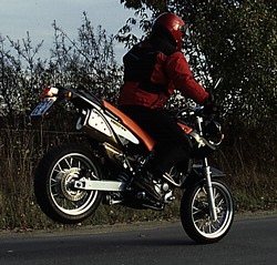Hier zeigt sich einer der Hauptvorteile der MuZ Mastiff. Die Maschine bietet einem routinierten Fahrer fahrwerks- und bremstechnisch große Reserven, ohne einen Anfänger zu überfordern. Führerschein-Neulinge können sich die Maschine auf 34 PS drosseln lassen. Nur selten wünschte ich mir bei dem von uns gefahrenen Modell mehr als die fünfzig gebotenen Pferdestärken. Allerdings versicherte mir ein Motorradmechaniker, daß sich aus dem Einzylinder durch ein wenig Feinarbeit noch ein paar zusätzliche Pferdchen herauskitzeln lassen, ohne daß die Standfestigkeit beeinträchtigt wird. Aber auch im Serientrim reicht die Leistung aus, um zum Beispiel beim Abbiegen den Hinterradpneu durch beherztes Gasgeben spaßeshalber etwas wegschmieren zu lassen.