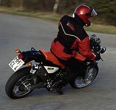 Bei 176 cm Körperlänge erreiche ich problemlos mit beiden Füßen den Boden. Die schmale Sitzbank ist straff gepolstert, aber nicht unnötig hart oder unbequem. Mangelhaft ist allenfalls die Soziustauglichkeit, doch wird sich kaum jemand eine Mastiff zulegen, um regelmäßig Ausflüge zu zweit zu machen. Der Knieschluß zum Tank ist wiederum perfekt und der Abstand zu den Fußrasten angenehm groß. Der Fahrer sitzt ein klein wenig nach vorne gebeugt, dicht hinter dem breiten Lenker. Die Sitzhaltung ist zum Kurvenräubern wie geschaffen. Hohe Dauergeschwindigkeiten auf der Autobahn schließt sie natürlich aus, schon oberhalb von 120 Stundenkilometern wird der Winddruck unangenehm. Die Höchstgeschwindigkeit von 160 km/h hat somit eher theoretische Bedeutung. Sie interessiert aber auch niemanden wirklich, denn die Mastiff ist nunmal, wie schon erwähnt, zum genüßlichen Umrunden enger Kurven mit möglichst großer Schräglage gebaut worden.