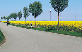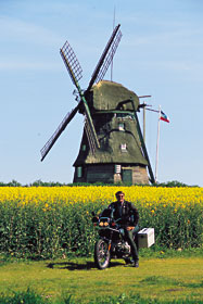 Einmal nicht aufgepasst und eine Lücke im Knick übersehen, ergreift der Wind urplötzlich seine Chance und drängt das Motorrad aus der Spur. Hier an der Ostsee weht fast immer eine steife Brise. Hunderte von Windrädern sind über die ganze Insel verteilt und nutzen den ständigen Luftstrom zur Energiegewinnung.