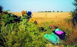 Geizig wie wir sind, und ohnehin der Meinung, der Name AUTObahn habe was zu bedeuten, nahmen wir das Unternehmen in Angriff, Paris weiträumig zu umfahren. Das führte erst ganz flott über Arras, Amiens, Beauvais und dann aber auf immer kleinere Straßen; ständig rauschten einheimische Motards stiefelausstreckend an uns vorbei, aber die kennen die Landschaft ja auch schon. Wunderschön war es bei Mantes an der Seine, aber mit einem anderen Motto als „der Weg ist das Ziel” hätte man doch die Autobahn nehmen müssen. Am Abend kamen wir, reichlich geschafft, in Tours an, wo wir romantisch an einem Sonnenblumen- feldrand kampieren konnten. Wunderbar, dieser französische Wein!