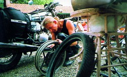 Wieder zurück auf dem Hof, suchten wir in dem sehr ordentlichen Räderregal nach einem passenden Exemplar. Tatjana entdeckte das einzige 17-Zoll-Rad. Alle Maße paßten genau; kein Wunder, die GS 1000 mit Speichenrädern war auch nur eine kleine Serie, und dafür konstruieren die Japaner ja nichts um. Der Einbau ging bei herrlichem Wetter auf der Einfahrt vonstatten. Das alte Rad blieb zurück, nur die Lager habe ich mitgenommen. Die ganze Sache kostete uns 400 Francs – ein mehr als fairer Preis dafür, dass wir derart „dans la merde” steckten, wie einer der angestellten Flexer sachlich feststellte.
