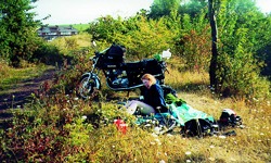 Wäre mir in dem Moment mein Schutzbrief eingefallen, wir hätten das Moped der Zahlstellenpolizei anvertraut und den Zug genommen. So aber schlichen wir, ich halb auf dem Tank und Tatjana halb auf meinem Platz sitzend, zur nächsten Ausfahrt (was können 5 km weit sein) und wollten in ein Motel. Aber: leider alles belegt und eh seit 22 Uhr geschlossen (es war halb elf). Also Motorrad zu einer nah gelegenen Wiese neben einer Grundschule geschoben, wobei ich mir wünschte, die Ohrstöpsel noch drinnen zu haben: das Ächzen der verbliebenen Speichen klang mir wie das hohle Lachen unseres ungebetenen Passagiers. Es hatte den Abend Unwetter gegeben, aber wir legten uns trotzdem einfach an den Wegrand. Zum Glück blieb es die Nacht über trocken. Am Morgen vor Schulbeginn ließ uns der Hausmeister netterweise in die Waschräume.