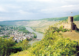 Da mein Benzinvorrat noch einen kleinen Abstecher erlaubt, schaue ich mir noch die Burgruine Landshut in Bernkastell-Kues an. Traumhafte Straßen führen über serpentinartige Strecken auf einen Parkplatz oberhalb der Burgruine. Auf dem Fußweg zur Burg eröffnet sich ein wunderschönes Panorama über das Moseltal. Ausgerechnet jetzt gibt auch noch der Fotoapparat den Dienst auf.