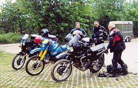 Im Ort angekommen erkundige ich mich an einer Tankstelle nach dem Ténéré-Treffen: Schulterzucken. Tolle Organisation, denke ich. Wo sind die versprochenen Schilder? Und wo sind überhaupt Motorräder, geschweige denn Enduros oder Ténérés? Ist das überhaupt heute? Dann kommt mir endlich eine Ténéré entgegen. Schnell umgedreht und hinterher. Vielleicht weiß der Fahrer ja mehr. An einer Tankstelle treffe ich schließlich Michael mit seiner Ur-Ténéré. Da er schon letztes Jahr da gewesen ist und den Weg kennt, fahren wir gemeinsam zum Treffpunkt. Dort treffen wir auf Markus mit seiner Super-Ténéré und Dietrich mit einer Transalp. Sie sind sich auch nicht sicher, ob das Treffen heute stattfindet, da eigentlich ab 13 Uhr jemand da sein sollte, der Platz aber völlig verlassen ist.