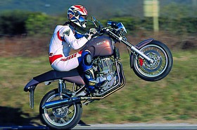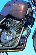 Die Roadster 650 ist nun aber kein seelenloses Sammelsurium irgendwelcher Zulieferteile geworden. Die Techniker um Hartmut Huhn taten es nämlich guten Köchen gleich und verfeinerten die Zutaten, woraus in der Kombination etwas völlig Neues entstand. Der Vierventil-Single leistet in der Suzuki-Originalversion nur 48 PS und bläst seine Abgase ungefiltert ins Freie. Sachs verpasste dem Eintopf ein Sekundärluftsys-tem, einen Doppelvergaser und vor allem das besagte Lafranconi-Megaphon. Die erstaunlich frei und kernig tönende Tüte ist denn auch hauptverantwortlich für die Leistungssteigerung auf volle 50 PS. Eine 34-PS-Version ist ebenfalls zu bekommen. Das Drosseln/Entdrosseln erfolgt über die Vergaserschieber und ist in knapp zehn Minuten erledigt.