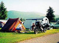 Über äusserst reizvolle, einsame Straßen schlängeln wir gen Korbach; wir halten uns nordwestlich und gelangen über Adorf nach Heringshausen am Diemelsee. Laut Karte befindet sich im Ort am Rande des Diemelsees ein Campingplatz. Dass es zwei Plätze gibt, erfahren wir erst später. Mit den letzten Strahlen der Sonne rollen wir auf das Gelände der Anlage. Ein Blick um die Häuserfront zeigt, dass wir nicht die einzigen Moppedfahrer sind, die hier Unterschlupf suchen.