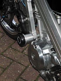Lieferbar sind die montagefertigen Pads wie gezeigt, in Alu, in Polyamid und – sehr edel und leicht – Carbon mit Aluschaumkern. Die Preise für ein Set beginnen knapp unter 100 DM und gehen bis über 400 DM – je nach Ausführung und Befestigungsmaterial. Einzelanfertigungen wie in unserem Fall sind natürlich auch möglich und so sieht man demnächst evt. auch Cruiser mit Sturzpads statt Chrom-Sturzbügelgeschwüren.
