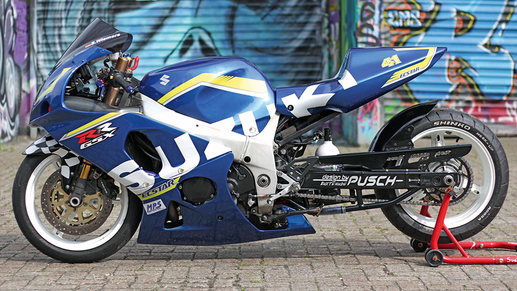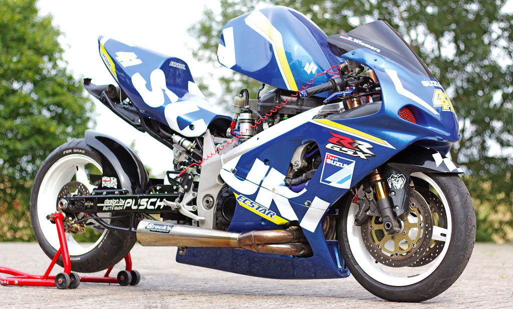 Die GSX-R wurde vorne 6 cm und hinten 8 cm tiefer gelegt, um den Schwerpunkt so tief wie nur möglich zu halten und damit die Wheelieneigung zu verhindern.