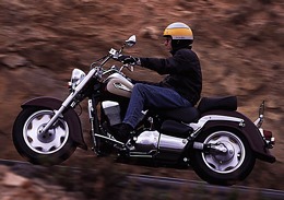 Der VL 1500-Treiber hält sich freiwillig an alle Geschwindigkeitsbeschränkungen. Und das sogar auf Landstraßen, denn so stur die Fuhre geradeaus läuft – bei rekordverdächtigen 1700 Millimeter Radstand und 138 Millimeter Nachlauf kein Wunder -, so abenteuerlich werden auch etwas zu schnell angegangene Kurven. Wer nämlich der Meinung ist, Überschußgeschwindigkeit mit zusätzlicher Schräglage kompensieren zu können, wird von der VL eines besseren belehrt. Die Schräglagenfreiheit geht gegen Null, und dabei sind die früh aufsetzenden Trittbretter gar nicht mal so schlimm, weil klappbar. Doch danach kommen – immer noch viel zu früh – die Trittbrett-Halter. Und die sind starr mit dem Rahmen verschraubt. Wer allerdings vor Biegungen jeglicher Art früh vom Gas geht, braucht noch nicht einmal die für Cruiserverhältnisse ordentlichen Bremsen (je eine Scheibe vorne und hinten) übermäßig zu quälen. Die Bremswirkung des Twins reicht meist völlig aus, um aufrechten Hauptes ums Eck zu biegen. Bei etwas engeren Kehren ist allerdings körperlicher Einsatz am Lenker gefragt. Das fette 150er Gummi auf der 16-Zoll-Vorderradfelge möchte nachdrücklich zur Kursänderung gezwungen werden. Hinten sind es übrigens ebenfalls beachtliche 180 Millimeter Breite auf einem 15-Zoll-Rad.
