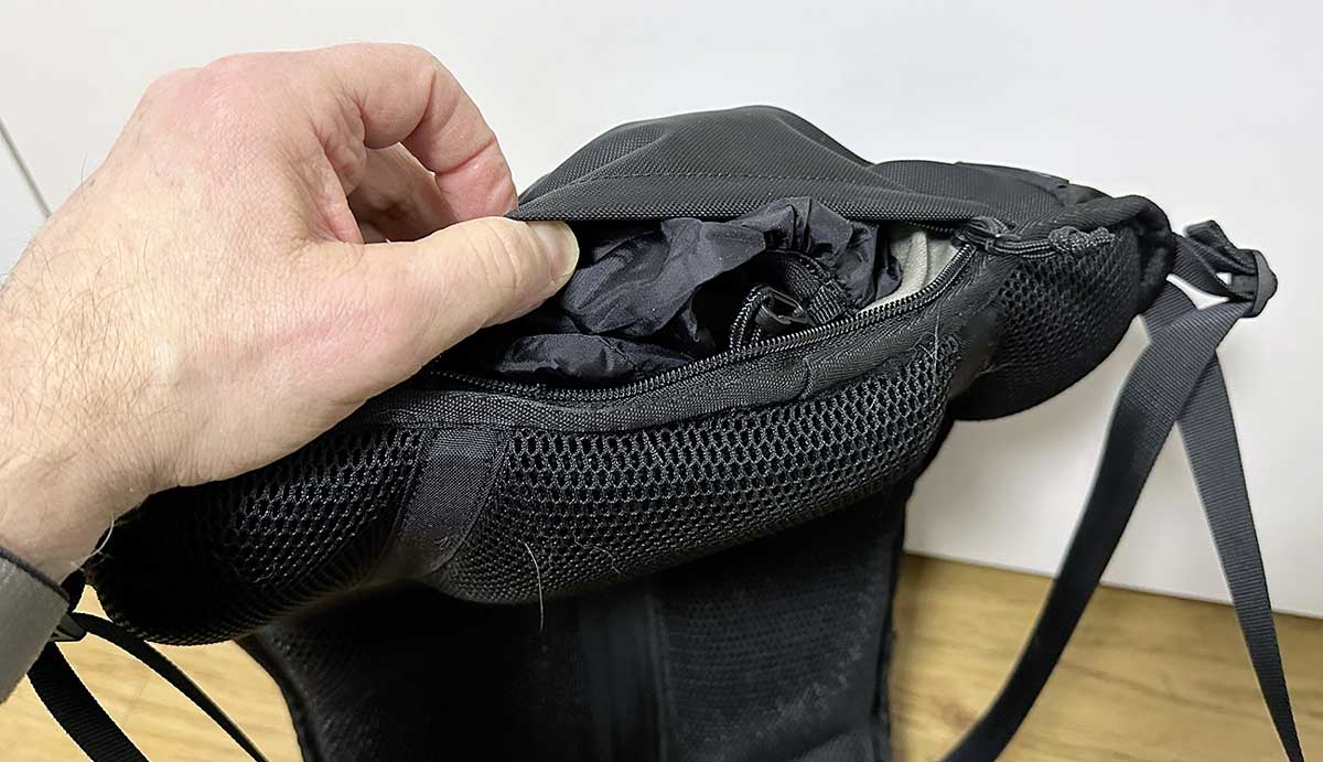 Im Hauptfach des Rucksacks befindet sich ein abgegrenztes, gepolstertes Fach, das Laptops oder Tabletts bis zu 15 Zoll aufnimmt. Alternativ lässt sich hier auch eine Trinkblase verstauen, SW Motech hat an eine Trinkschlauchdurchführung gedacht. Speziell Offroad-Fans wissen das zu schätzen. Zwei weitere Außenfächer sind über jeweils zwei Reißverschlüsse zugänglich. Der „Molle-Aufsatz“ (das stabile Gitter) auf dem Deckelfach nimmt bei Bedarf weiteres Zubehör auf. Im Boden des PRO Cosmo ist eine Regenhaube versteckt, die mit fest angenähten Schlaufen gegen Wegfliegen gesichert wird. Ein paar reflektierende Details erhöhen die Sicherheit bei Nacht.