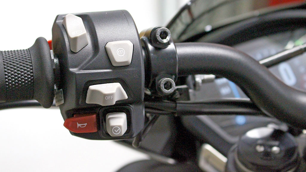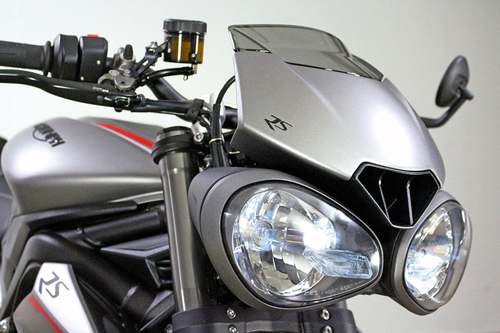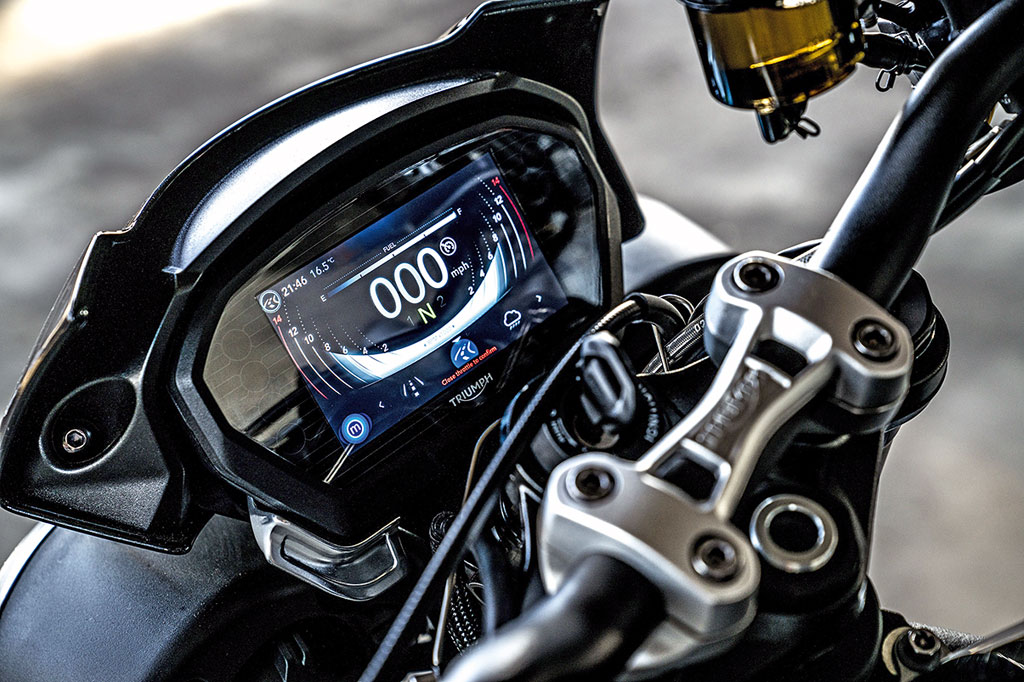 Die RS überzeugt aber nicht nur auf den ersten Blick. Auch bei genauerem Hinsehen leistet sich die Triumph keinen Schwächen und glänzt vor allem mit den Details. Freut man sich zum Beispiel schon wie ein kleines Kind über die High-End-Bremsanlage und die Kombination aus Brembo-Sätteln und Stahlflex-Leitungen, wird das Grinsen noch ein bisschen breiter, wenn man bemerkt, dass sich der zugehörige Bremshebel nicht nur aus der Entfernung einstellen lässt, sondern auch die Übersetzung der Bremspumpe variabel ist. Wohin das Auge auch blickt, überall steckt ein bisschen mehr drin. Sei es die neue Lampeneinheit, die durch das überarbeitete Design und das LED-Tagfahrlicht nicht nur mehr Dynamik ausstrahlt, sondern bei der Nachtfahrt auch mit überragender Lichtausbeute überzeugt oder das brandneue TFT-Display, das neben einer Fülle von Informationen und Einstellmöglichkeiten auch mit toller Ablesbarkeit und intuitiver Bedienung begeistert.