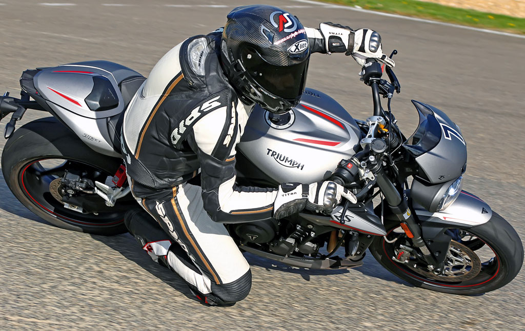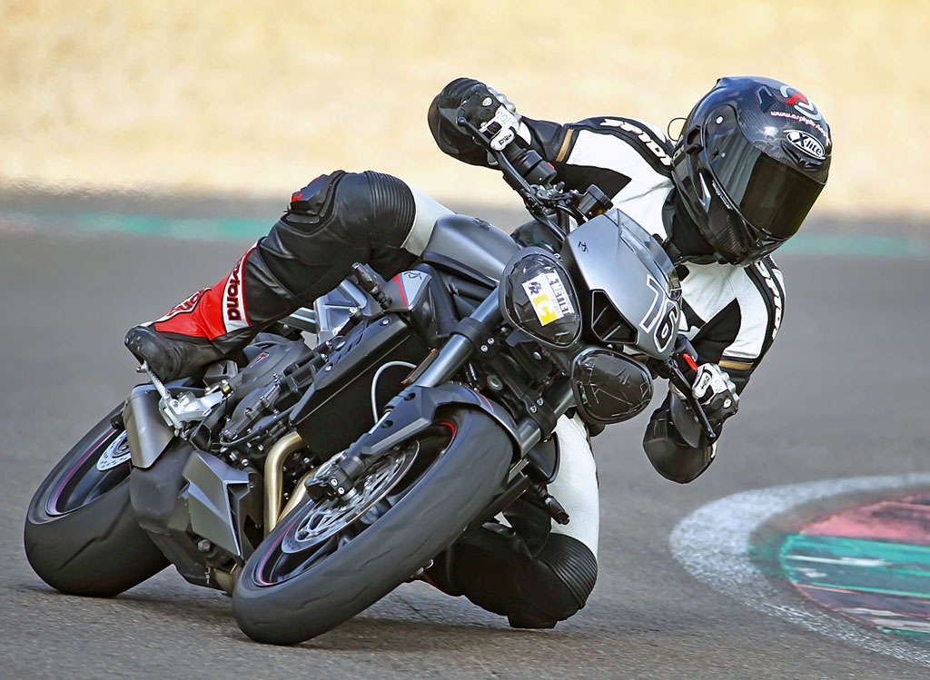 Das ist dann aber auch schon der einzige Kritikpunkt beim Einsatz auf der Rennstrecke. Im Straßenbetrieb gab es bei der Schräglagenfreiheit keinen Grund zur Beschwerde. Nachdem sich das Fahrwerk der Triumph auf der Renne als äußerst hartgastauglich erwies, lag hier eher die Vermutung nahe, dass die Dämpfer für den normalen Straßenbetrieb zu straff ausgelegt sein könnten. Doch auch auf der großen Landstraßenrunde mit mittelprächtigem Belag gab sich die Streety keine Blöße. Die Federelemente bügeln sensibel auch über grobe Macken im Asphalt hinweg und berichten dabei haarklein über den Status Quo an Vorder- und Hinterhand. Und so sammelt die Streety auch im öffentlichen Verkehrsraum jede Menge Punkte und überzeugt hier erneut mit der großartigen Sitzposition, der sehr leichtgängigen Kupplung, dem tollen E-Gas und – wen wundert’s – wieder mit dem Motor, der durch sein piekfeines Ansprechverhalten ab Standgasdrehlzahl auch im Stadtbetrieb jede Menge Freude bereitet.