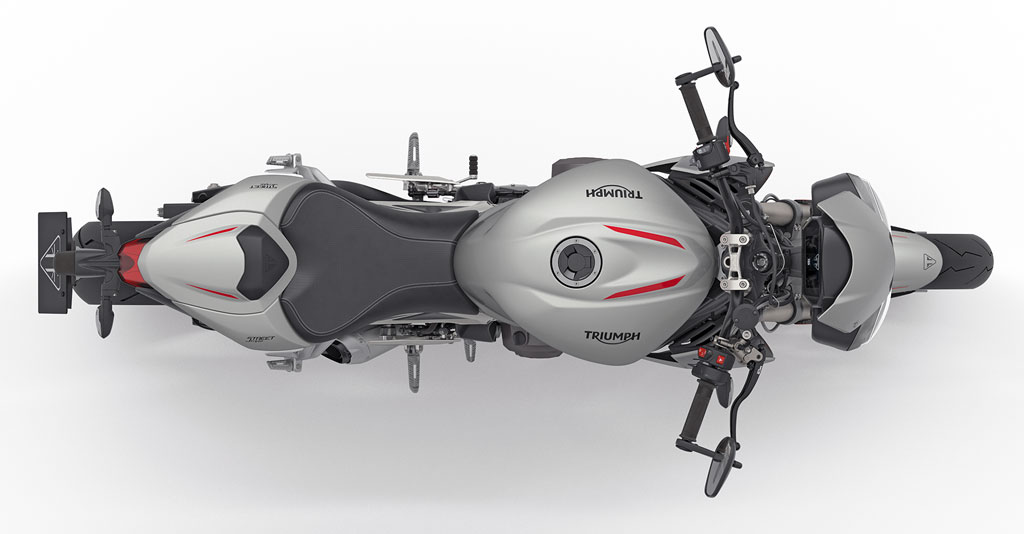 Das dachten sich auch die Ingenieure bei Triumph, gingen beim Motor in die Vollen und spendierten dem Dreizylinder ein dickes Hubraumplus, welches sich äußerst positiv auf die Leistungswerte auswirkt. Der nun 765 ccm große Motor (früher 675) drückt laut Triumph in der RS-Version jetzt satte 123 PS sowie 77 Newtonmeter Drehmoment auf die Prüfstandsrolle. Das sind immer noch keine Werte, bei denen man Angst haben muss, dass die Streety beim Gasaufziehen den Asphalt ins Stücke reist, aber für ein Landstraßenmotorrad mehr als ausreichend. Vor allem für ein so leichtes wie die Street Triple. Mit ihren 166 Kilogramm Trockengewicht liegt sie 2 Kilo unter dem Wert ihrer Vorgängerin und verspricht so schon auf dem Papier ein noch agileres Fahrverhalten. In Anbetracht des größeren Motors, der nun vorhandenen Anti-Hopping-Kupplung und vor allem aufgrund der Euro-4-Auspuffanlage ist das besonders erstaunlich.