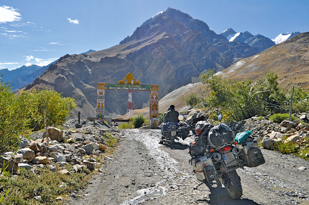 Auf dieser Abfahrt begegneten mir die zwei Inder auf einer Enfield, die den gleichen Traum in Alp erlebten. Manchmal redeten wir, dann fuhr wieder einer, dann begegneten wir uns wieder und dann fuhr wieder einer und dann … dann standen wir an einer Kreuzung und sie erklärten, dass sie in diesen Schotterweg abbiegen würden, weil sie ins Spiti-Tal fahren, zum höchsten Dorf mit dem ältesten Kloster.