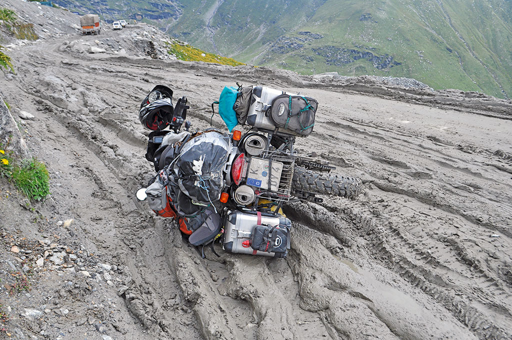 Was hatte mich heute Vormittag dazu veranlasst mich durch den kilometerlangen Matsch über den Rothang Pass zu quälen, obwohl ich doch umdrehen wollte, wenn es zu schwierig wird? Alle paar Meter rutschte ich weg, so dass ich schon nach den ersten Umfallern kaum noch Kraft hatte die BMW aufzurichten. Die Mopedstiefel versanken teilweise bis zur Wade im Matsch und saugten sich fest. Viel besser konnte das nur noch der Seitenkoffer, wenn er plan in die klebrige Erdmasse fiel. Dann entstand beim Aufheben ein Sog am Untergrund, so dass mindestens drei Mann nötig waren, um das Bike wieder aufzuheben. Ich zitterte schon beim Aufsteigen und war froh um jede Pause, die mir ein Jeep oder Truck lieferte, der vor mir freigeschaufelt werden musste, weil er feststeckte.