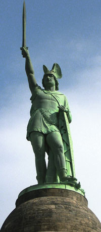 Weiter westlich treffe ich bei Detmold im Teutoburger Wald in Hiddesen auf das Hermannsdenkmal. Das Denkmal mit einer Gesamthöhe von 53,46 m steht auf der Grotenburg, einem 386 m hohen Berg südwestlich von Detmold. Es soll erinnern an die Varusschlacht (die Hermannsschlacht) im Jahre neun nach Christus, bei der das gesamte römische Besatzungsheer von drei Legionen und sechs Hilfskontingenten, insgesamt wohl eine Armee von bis zu 25.000 Mann, vernichtend geschlagen wurde.